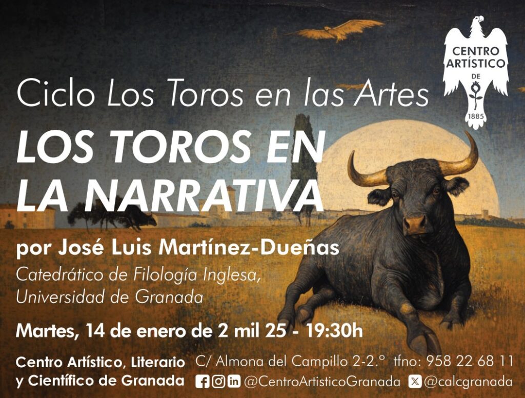 El martes 14 de enero José Luis Martínez-Dueñas imparte la conferencia ‘Los toros en la narrativa’ a las 19:30 en el Centro Artístico de Granada.