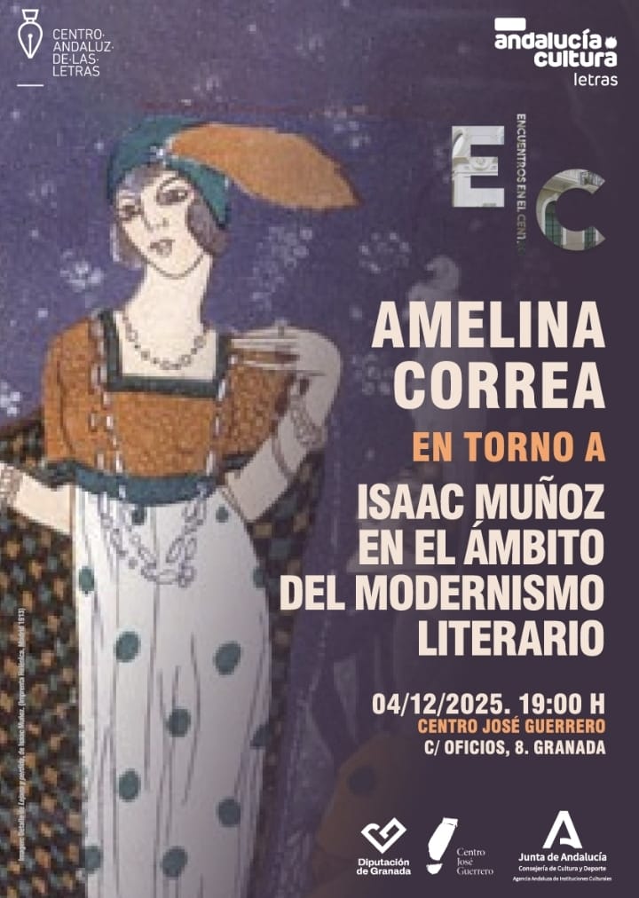 Conferencia «Amelina Correa en torno a Isaac Muñoz en el ámbito del modernismo literario» Nov 27, 2025 Dada por la académica Amelina Correa, tendrá lugar el jueves 4 de diciembre a las 19:00 horas en el Centro José Guerrero. ← Volver a Noticias