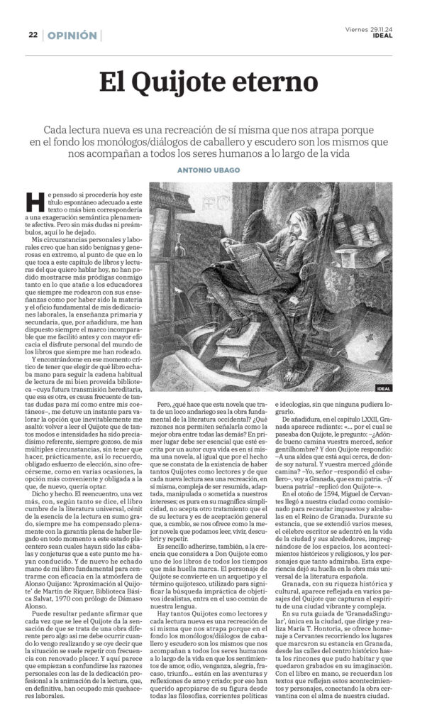 “Cada lectura nueva es una recreación de sí misma que nos atrapa porque en el fondo los monólogos/diálogos de caballero y escudero son los mismos que nos acompañan a todos los seres humanos a lo largo de la vida”