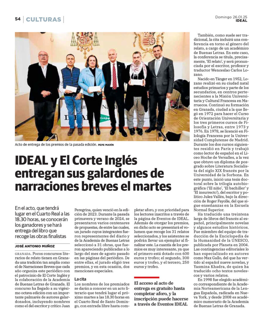 Ideal y El Corte Inglés entregan sus galardones de narraciones breves Ene 28, 2025 En el Cuarto Real de Santo Domingo el 28/01/2025 a las 18:30 horas. ← Volver a Noticias