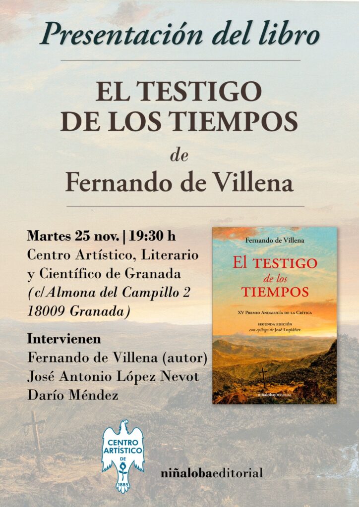 Presentación del libro “El testigo de los tiempos” de Fernando de Villena Nov 21, 2025 Tendrá lugar el próximo martes 25 de noviembre a las 19:30 horas en el Centro Artístico, Literario y Científico de Granada. ← Volver a Noticias